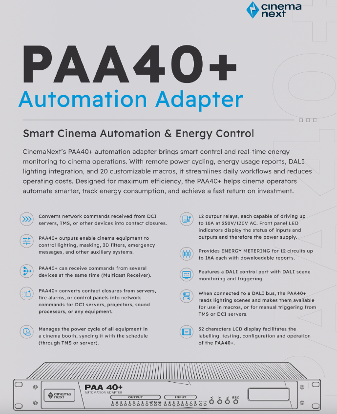 Developed to meet exhibitors' evolving needs, CinemaNext’s PAA40+ automation adapter brings smart control and real-time energy monitoring to your cinema operations. With remote power cycling, energy usage reports, DALI lighting integration, and 20 customizable macros, it streamlines daily workflows and reduces operating costs.