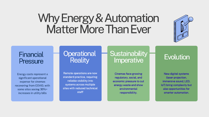"Thank you to the European Digital Cinema Forum for putting this together. Today I want to take you through one of the most urgent but often overlooked topics in this industry: energy monitoring and automation in our cinemas.